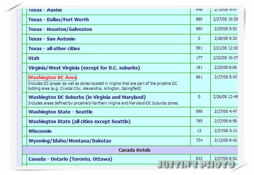 網路上還有教一些方法可以增加出價的次數,例如我常用的是找一區很偏僻的區域,假設它叫A區,且只有1~2星等級的旅館,那我會先試標WhiteHouse區,改條件時就加入A區,因為A區一定沒有3星以上,所以我可以確定有標到一定會落在WhiteHouse,而這樣就多了一次試價錢的機會。如果現在目標有兩區:White House(9)和Dupont Circle (6),那我會先標其中一區(9),然後關掉網頁重新搜尋,再標另一區(6),然後再標(6)+(9),這樣就有三次機會。如果第一次標完(9)就再標(9)+(6),這樣就沒辦法再標(6),因為他只讓你增加區、不讓你減區。(其實你也可以關掉重新搜尋6再標,但有時候它會告訴你不行,有時候甚至同一條件關掉再開還可以標,可能是系統問題吧?!)