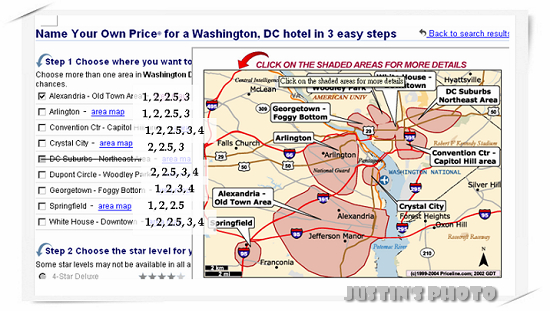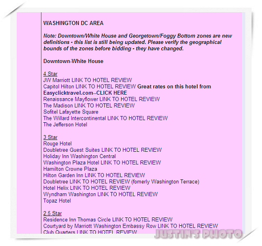 但要注意的是這些資料不一定準確,有時候會看到網友反映旅館星等跟標完的結果不一致,可能是被Priceline改星等;又例如上面說White House 跟 Georgetown這兩區範圍有重劃,所以基本上這個網站的資訊拿來做參考即可。