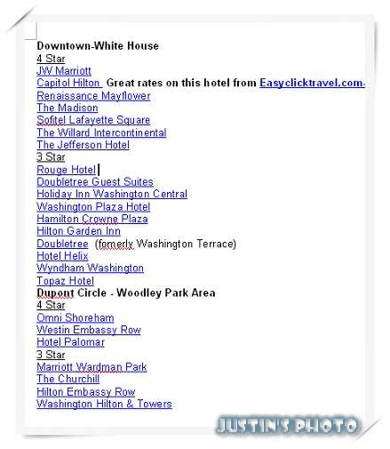 這裡有列表告訴你各區裡各星等有哪些旅館,例如在Downtown-White House這區(就是上面Priceline的第9區),四星級的旅館包括JW Marriott, Capitol Hilton...等。
