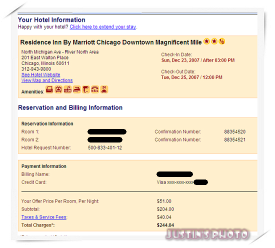 如果你幸運終於標到了,你會看到下面這個畫面,這時候就可以趕快去看看到底標到哪一間旅館(這張是我去年聖誕節用$51標到Chicago Downtown 的 Marriott,雖然兩星半好像不怎樣,但其實有廚房、冰箱跟更衣間,而且還位在鬧區走三分鐘就到Michigan Avenue,其實美國旅館星等跟我以前想的不一樣,這裡兩星半或三星我就覺得不錯了):